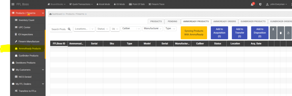 FFL Boss allows you to sync your products between your AmmoReady account and your electronic A&D bound book. This reduces double entry and allows you to quickly automate acquisitions, transfers or even direct dispositions to customers from your AmmoReady webstore: