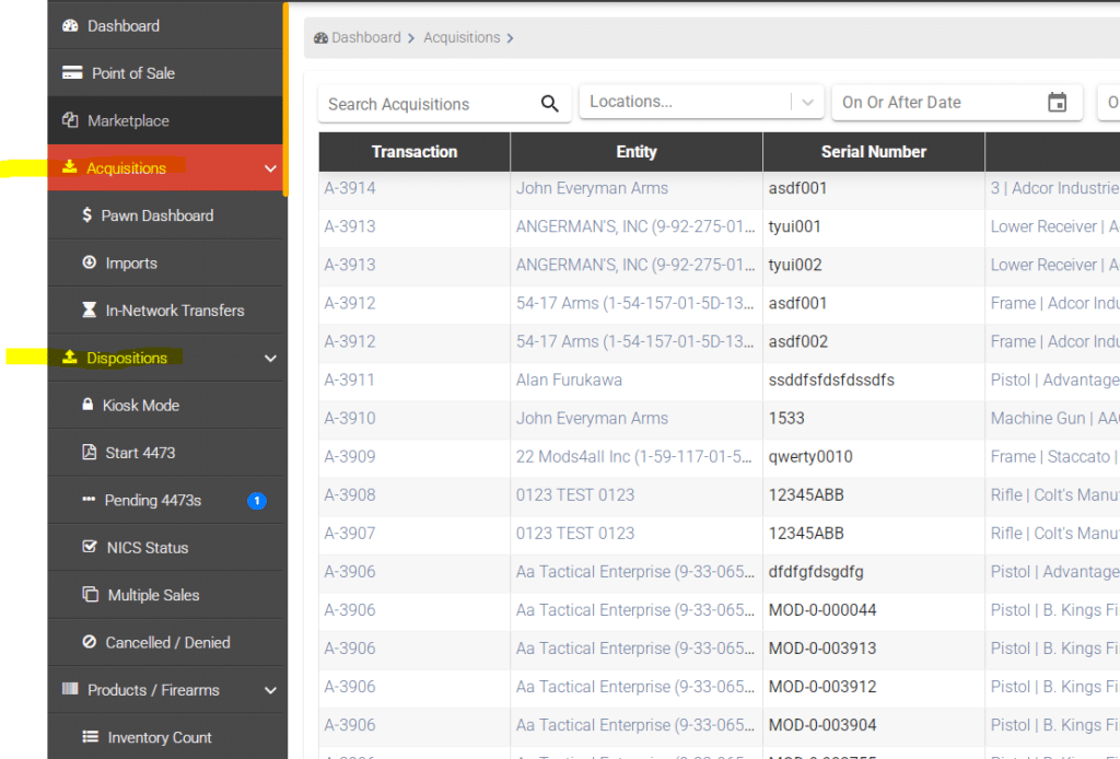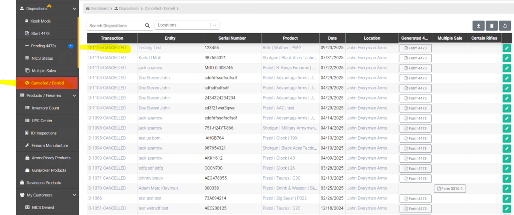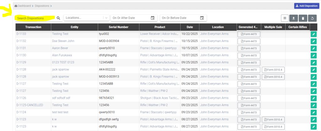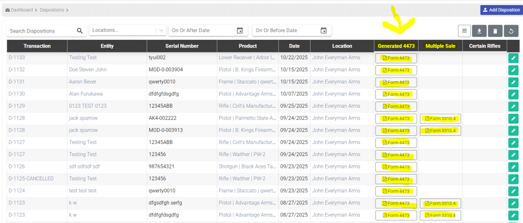 Our master Dispositions table retains Form 4473s in numerical order by default. You can click on the Date, Entity or Transaction column to resort them in alphabetical, chronological or numerical order. Queries can be made in our universal search for any combination of transferee, buyer name, transfer date, transaction number, firearm type, model, manufacturer, importer, caliber, size, gauge, serial number and just about anything else you can place on a 4473: