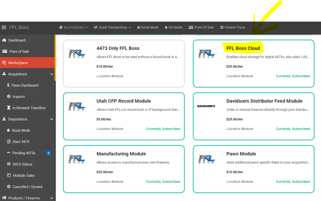 You can add FFL Boss Cloud as an add-on to your existing FFL Boss subscription by going into the FFL Boss Marketplace within your software: