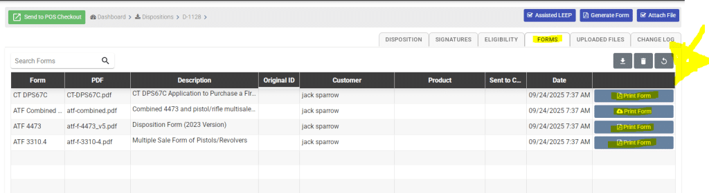 You can print any PDF in FFL Boss Cloud by clicking on it in the master Dispositions table or by going into any disposition, clicking on the Forms tab and printing any forms associated with that transaction: